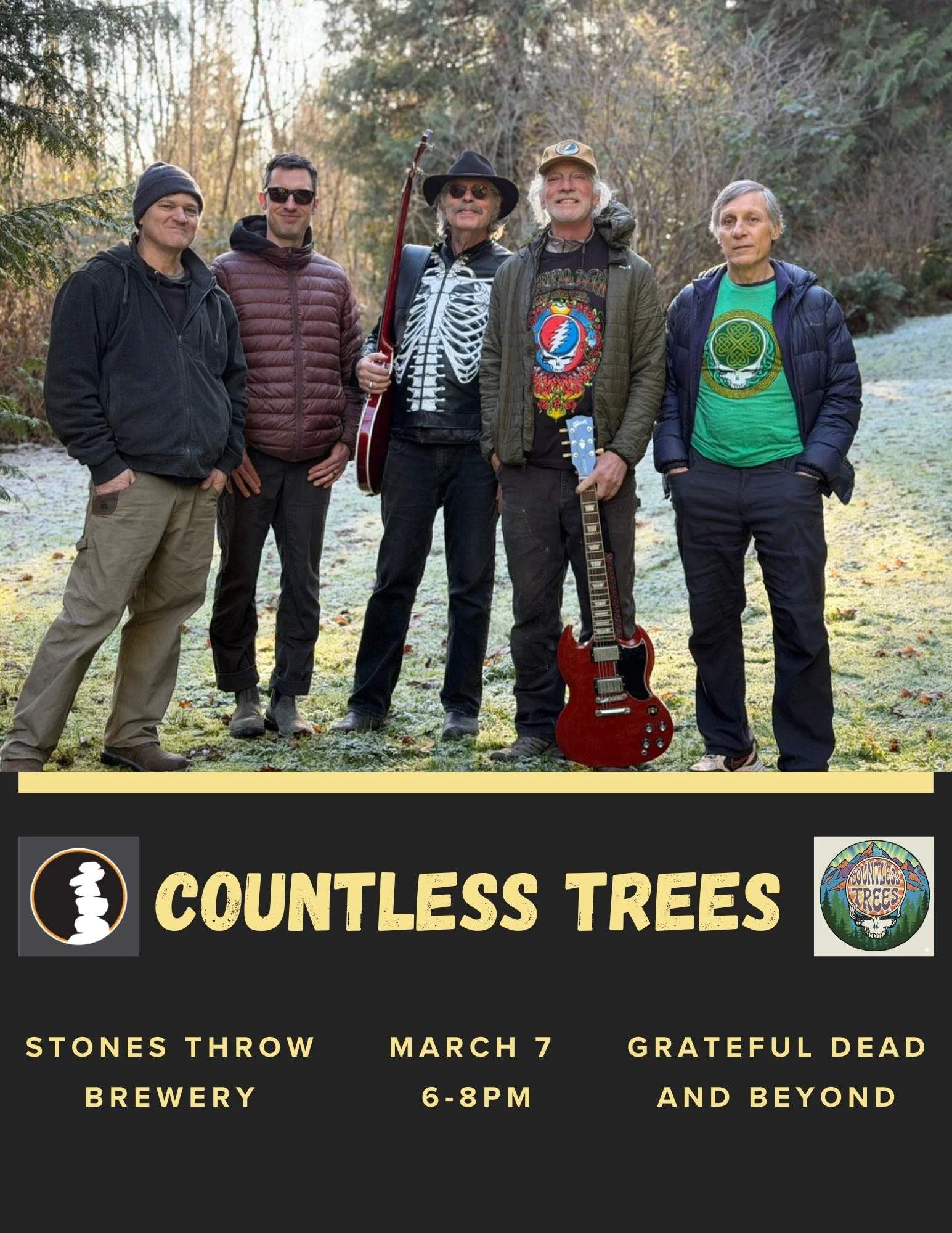 Countless Trees is comprised of some seasoned players, younger and older. With three members of the band being "original" Deadheads, they delve deeply into that realm, while also having fun playing the music of the many bands from that era that jammed and are affiliated with the Dead.