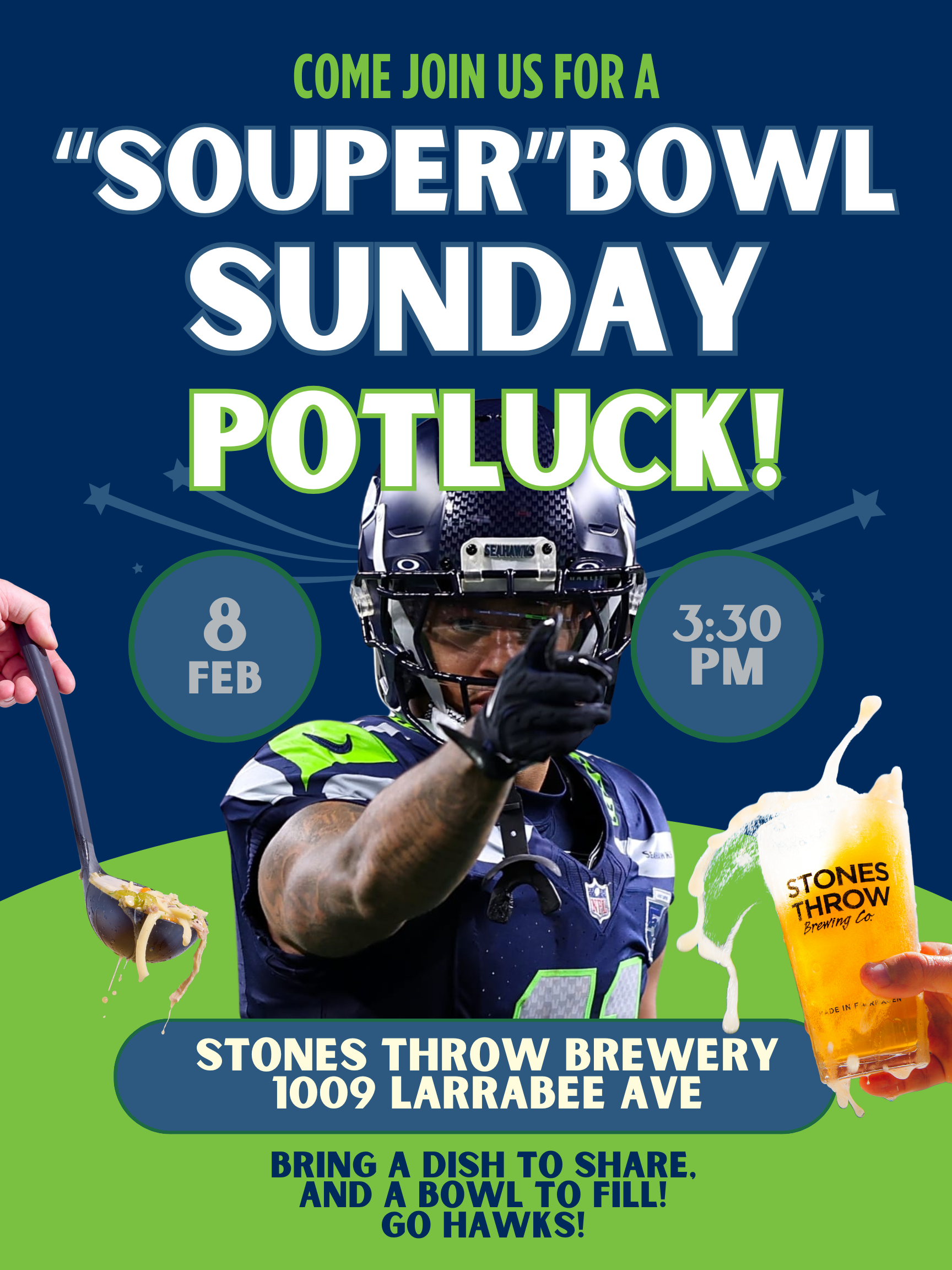 We're busting the projector out to broadcast the game and having a "Souper"bowl Sunday potluck in the backyard at Stones Throw! Bring your friends and fam and come join us for good company, brews, & bring a dish to share. This Sunday, February 8th, at 3:30pm!